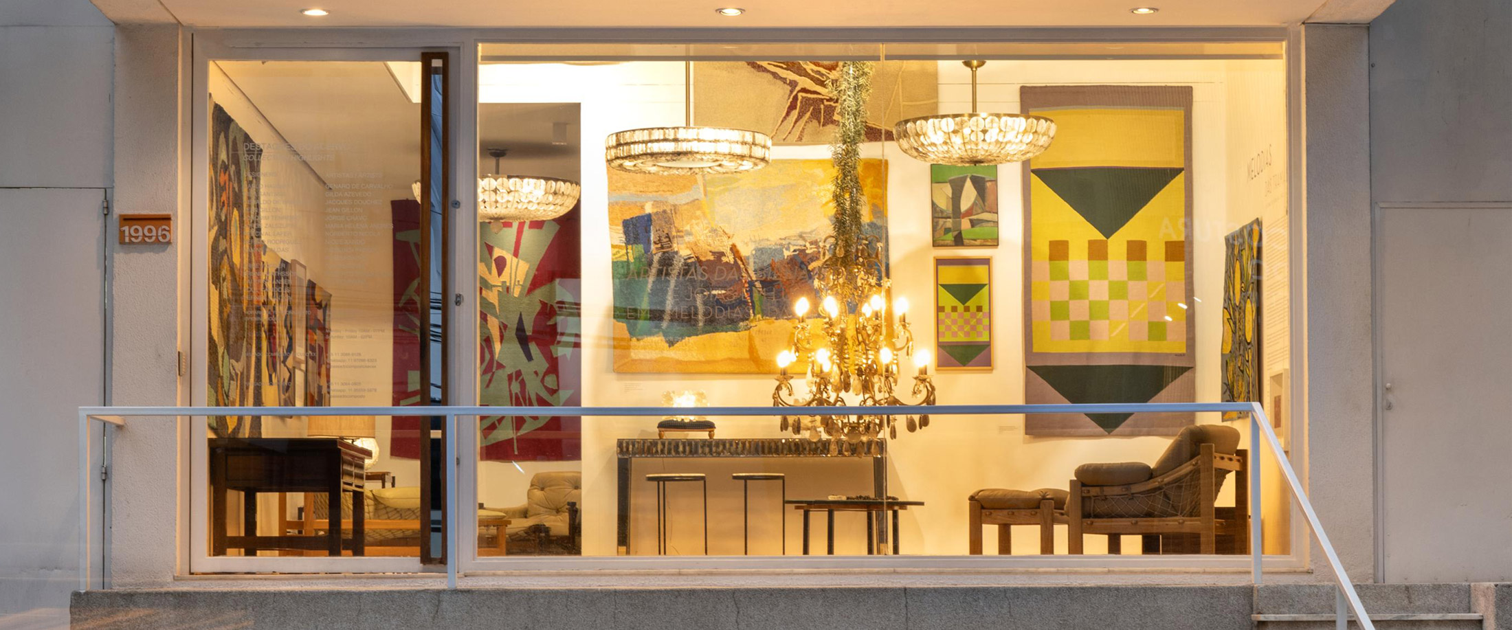 Apresentamos, na vitrine da galeria, sob nossa curadoria, a partir de novembro de 2025, uma coleção do acervo de obras de arte em pintura e tapeçaria modernas, criada por seis artistas renomados participantes das "Bienais de São Paulo", entre 1951 e 1994: Genaro de Carvalho (2), Jacques Douchez (11), Norberto Nicola (7), Jean Gillon (1), Gilda Azevedo (1) e Maria Helena Andrés (10), indicados com o número de suas participações de destaque. Em diálogo com essas obras, a iluminação da vitrine é composta por "Jóias em Lustres": luminárias e arandelas concebidas em cristal de rocha - criações preciosas e exclusivas de Cida Santana, designer e fundadora da Passado Composto.